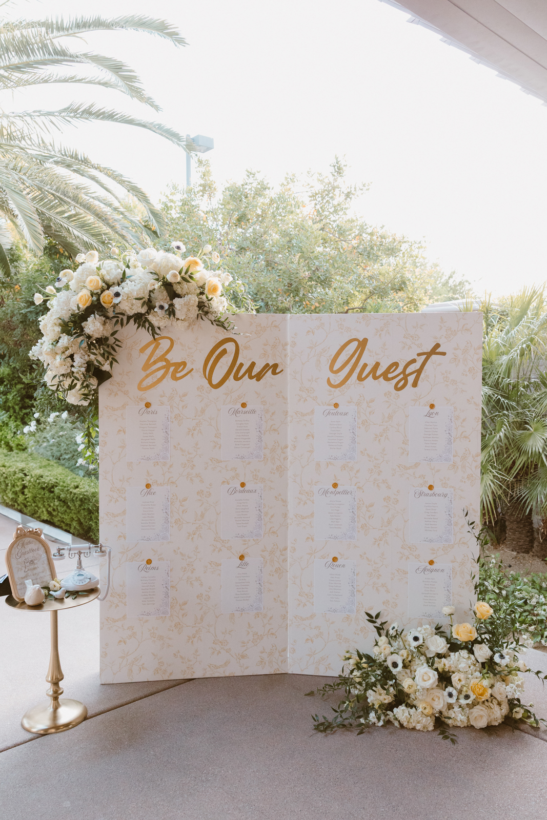 One of the standout features of the shoot was the seating chart, a breathtaking 6-foot wall adorned with custom pale yellow bird wallpaper from Royal Celebration Designs. Each table was named after a charming city in France, with vendors recognized through beautifully etched perfume bottles serving as place cards. This creative touch not only highlighted the collaborative spirit of the shoot but also celebrated the talents of all involved.